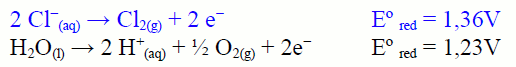 En el ánodo debería producirse O2 y no Cl2, pero como los potenciales son muy parecidos y como se necesita un sobrepotencial para realizar la electrólisis, al ser alta la concentración de